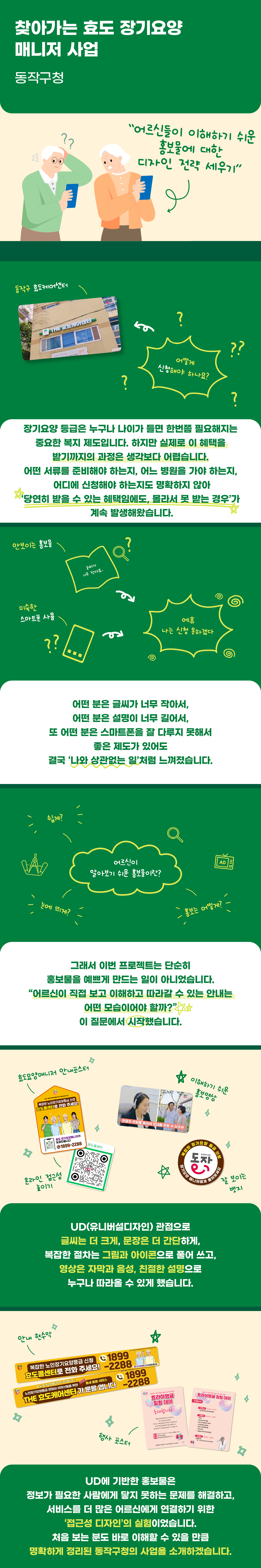 안녕하세요, 독자 여러분. 동작구청의 ‘찾아가는 효도 장기요양 매니저’ 사업을 소개합니다. 복잡했던 노인장기요양 서비스 정보를 쉽게 제공하며, 유니버설디자인(UD) 원칙을 반영해 어르신과 가족들의 불편을 해소하는 데 중점을 두고 있습니다.
