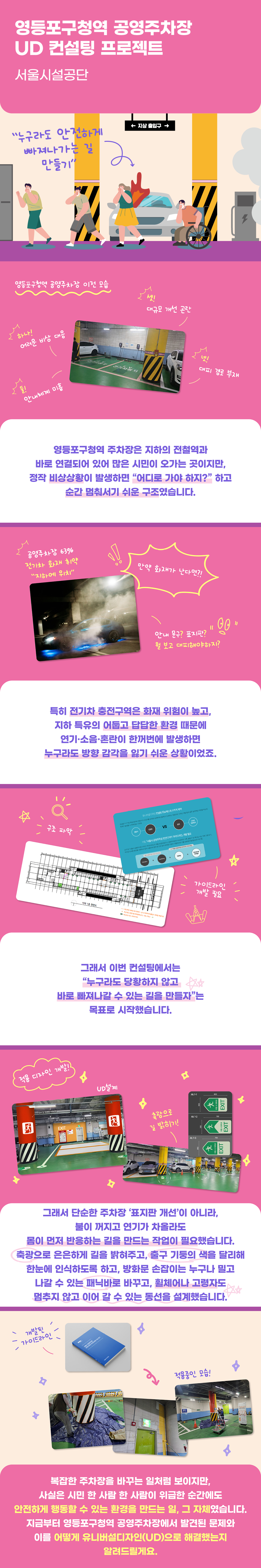영등포구청역 공영주차장 사례는 물리적 환경 개선이 쉽지 않은 공간에서도 디자인의 힘을 통해 시민 모두가 안심하고 이용할 수 있는 환경과 표준을 구현할 수 있음을 보여주었습니다.
