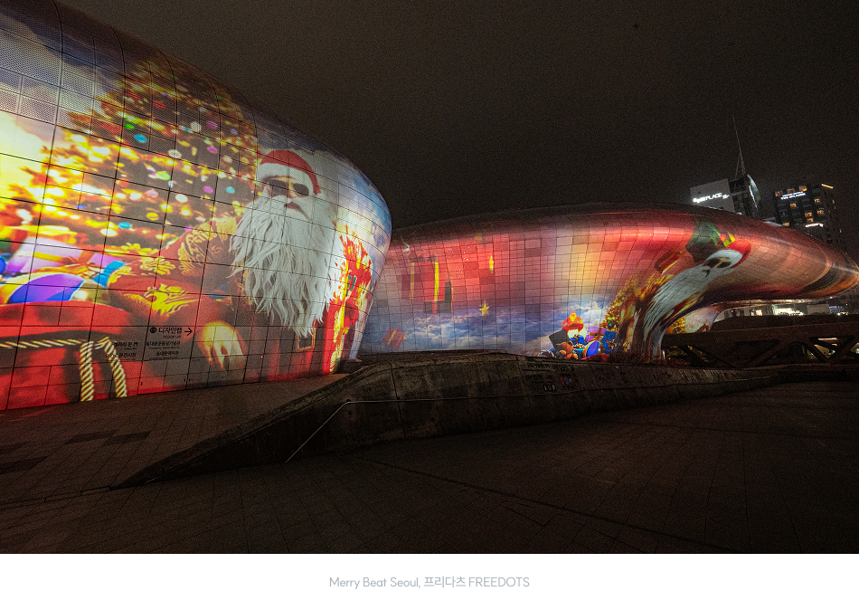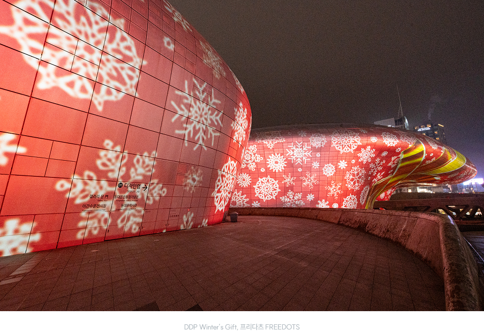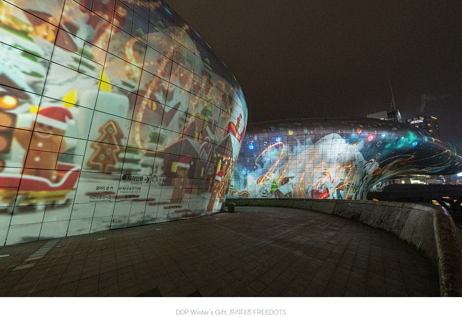 미래로 다리에서 시작된 별빛 조명이 건축의 곡선을 따라 흐르며 외벽 전면에 정교한 패턴을 그려낸다. 파사드에는 크리스마스를 상징하는 오브제와 조명이 겹겹이 새겨지며, DDP 전체가 거대한 궁전인 듯 연출된다. 미래로 다리에 설치된 별빛 조명과 미디어파사드는 동일한 패턴의 흐름을 공유하며, 조명과 영상이 맞물려 하나의 연속된 미디어아트를 만들어낸다.