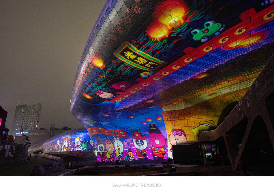 전 세계적으로 사랑받는 캐릭터인 라인프렌즈 LINE Friends와 미니니 minini, 조앤프렌즈ZO&FRIENDS가 겨울 밤 서울의 풍경에 포근한 인상을 남긴다. 밝고 친근한 캐릭터의 에너지가 건축 곡면을 따라 펼쳐지며, 브랜드의 감성이 커다란 스케일 안에서 입체적으로 구현된다.