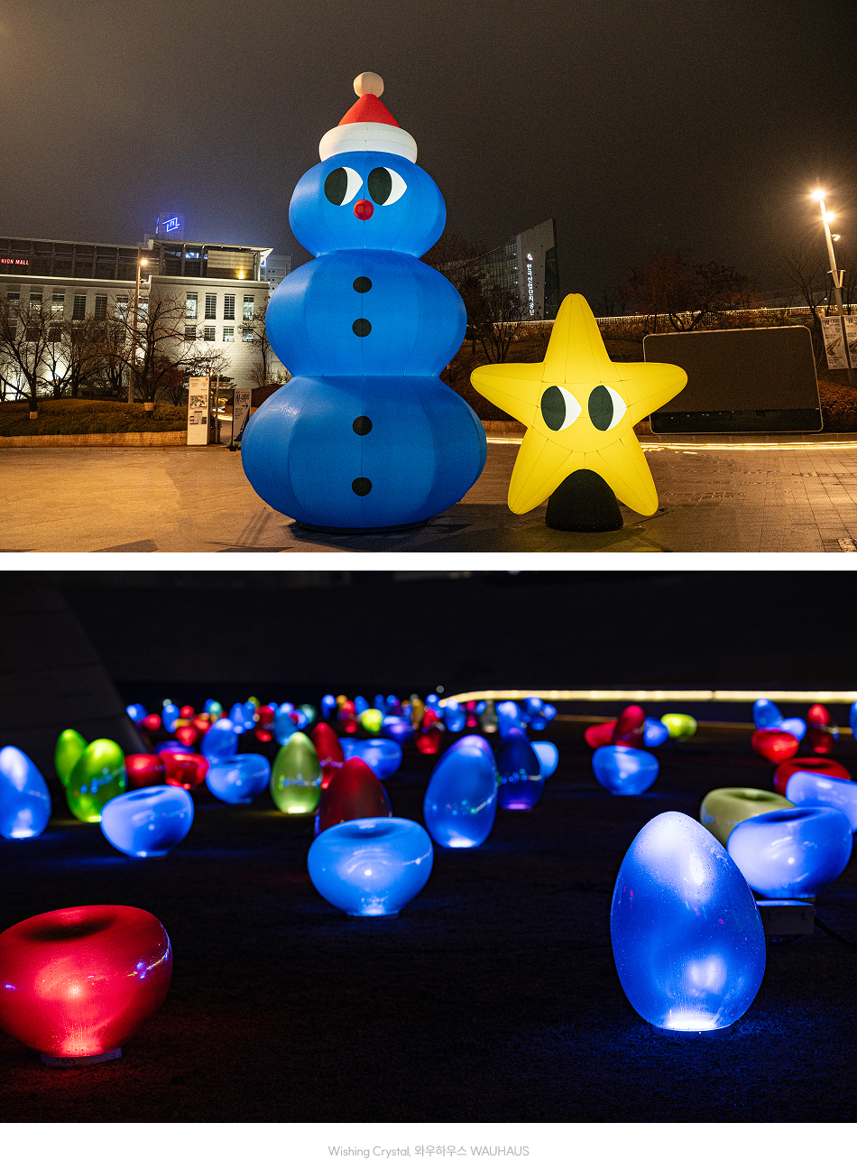미디어파사드에서 펼쳐진 이번 시즌의 이야기는 ‘힙(HIP)산타’를 매개로 DDP 전역으로 확장된다. DDP 크리스마스 타운의 마스코트인 힙산타가 공간 곳곳을 지나며 선물을 남기고 갔다는 설정 아래, 미디어아트 속에 등장한 캐릭터와 오브제들이 실제 공간 속 설치물로 이어진다. 디자인 거리의 ‘해치와 소울프렌즈’, 어울림 광장의 ‘라인프렌즈’, 팔거리의 ‘이야이야앤프렌즈’ 포토존은 각각 미디어 작품의 세계관과 색감을 재해석한 조형물로 구성되어, 영상에서 시작된 빛의 서사를 관람 동선 위에서 자연스럽게 이어간다. 이와 함께 잔디언덕에는 보다 감각적인 체험에 초점을 둔 설치 작품 ‘위싱 크리스탈 Wishing Crystal’이 전시되어 있다. 160개의 크리스탈 오브제가 음악과 조명에 반응하며 색을 변화시키는 이 작품은, 사람들의 소원과 희망을 빛의 리듬으로 시각화하며 크리스마스 타운의 분위기를 한층 입체적으로 완성한다.