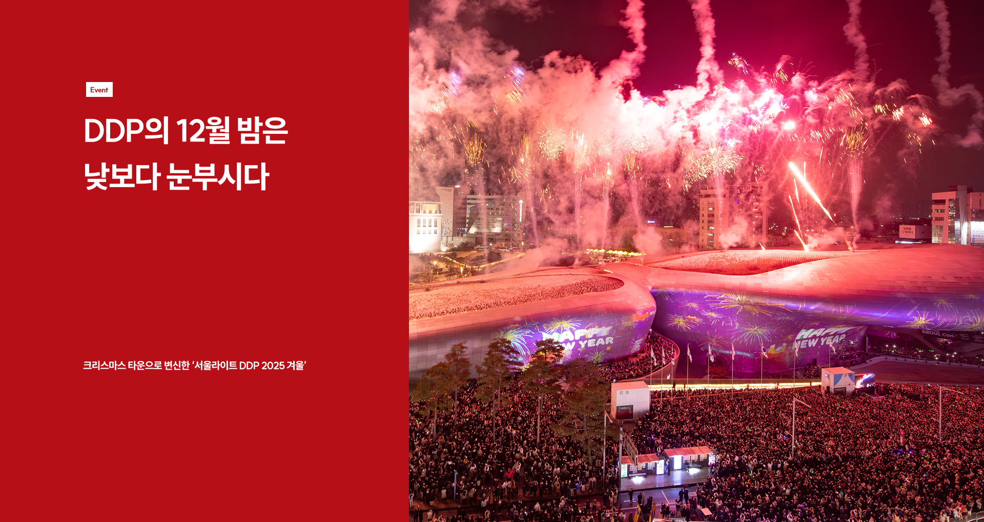 행사의 마지막 밤인 12월 31일에는 ‘Happy New 2026!’ 새해 카운트다운 이벤트가 펼쳐진다.세계 최대 비정형 미디어파사드를 활용한 카운트다운 연출과 하늘을 수놓는 불꽃쇼를 배경으로 DJ 박명수, 밴드 솔루션스 THE SOLUTIONS의 라이브 공연이 이어지며, 시민들은 한 해를 마무리하고 새해를 맞이하는 도심 속 축제의 순간을 함께한다. 서울라이트 DDP의 2025 겨울 시즌은 이렇게 연말의 시간과 풍경을 빛으로 채우며 막을 내린다.