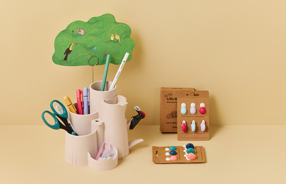 ‘달팽이 언박싱 커터’로 해외 소비자의 공감을 이끌어낸 피그랩의 딱따구리의 숲 연필 꽂이 외. 폐목재와 칫솔 부산물로 발생하는 자투리 플라스틱을 활용한 친환경 사무용품이다.