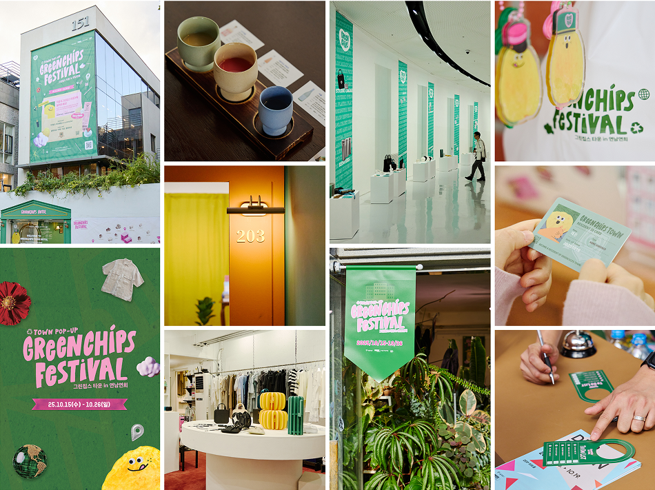 이 사업이 특별한 또 한 가지 이유는 시민과의 접점에 있다. 지속가능한 디자인을 설명하는 데 그치지 않고, 직접 보고, 걷고, 체험하도록 만든 것이다. 시민 참여형 축제 ⟪그린칩스 페스티벌⟫은 2025년에 3년 차를 맞아 DDP를 비롯해 연남·연희, 성수, 서촌 등으로 무대를 넓히며 누적 22만 명의 방문객을 기록했다. DDP 어울림광장에서는 그린칩스 제품으로 꾸민 호텔 콘셉트 쇼룸 팝업이 열렸고, 둘레길 갤러리에는 20개 참여기업의 제품이 전시됐다. 연남동에서는 ‘그린칩스 타운 호텔’이라는 콘셉트로 도시탐험가, 홈 가드너 등 라이프스타일별 객실을 구성해 친환경 실천을 자연스럽게 경험하도록 설계했다. 객실 미션을 통해 친환경 굿즈를 받고, ‘라운드(RRound)’ 앱 챌린지와 연계해 11만 건 이상의 실천 인증 게시물이 기록되며 오프라인 경험이 온라인 참여로 확장됐다. 또 연남·연희 지역 22개 상점과 협업해 동네 전체가 축제의 무대가 되는 풍경도 만들어냈다.