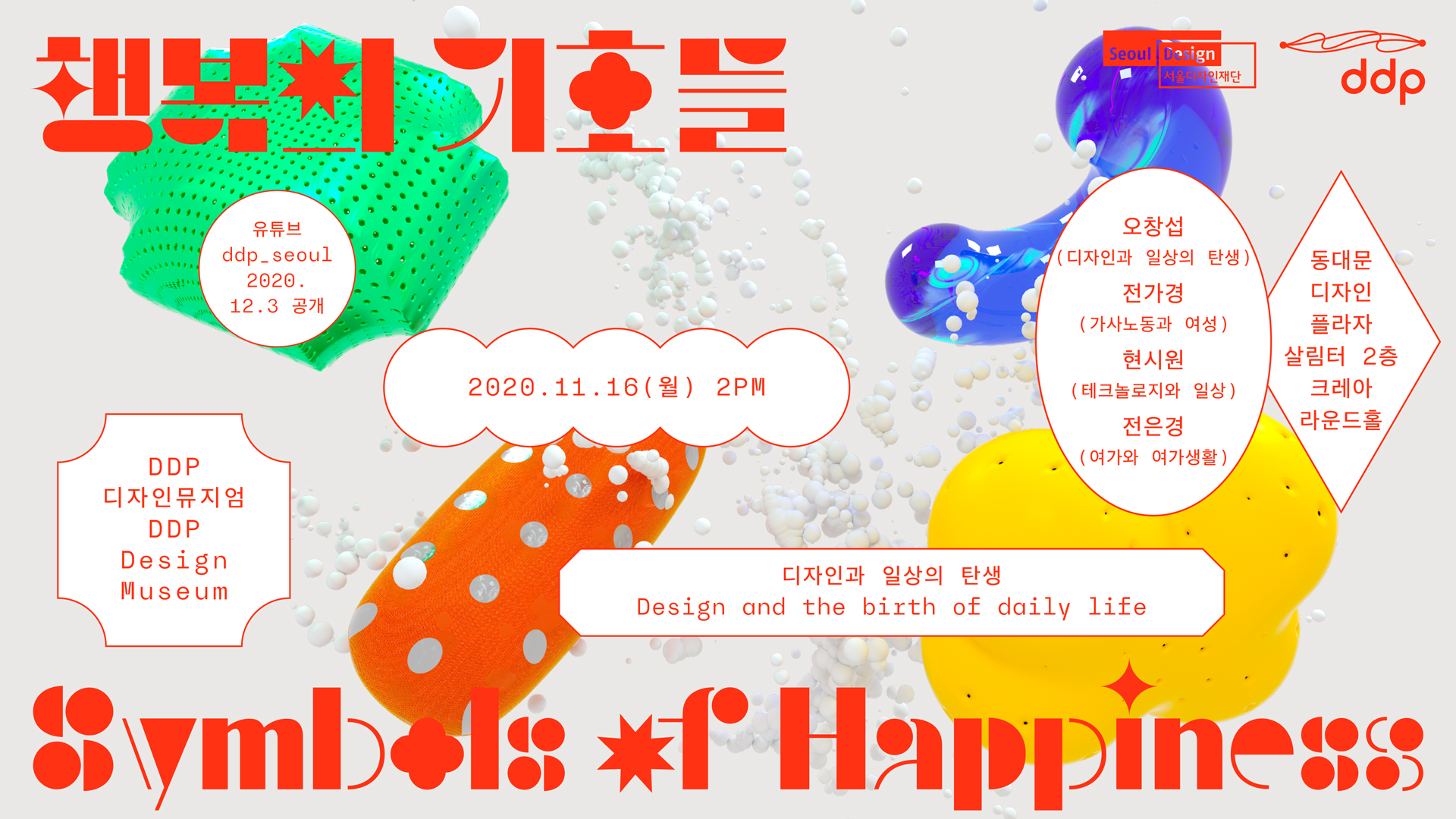 코로나 이전 우리의 일상은 어떠했을까? 그동안 당연한 것으로 생각해 왔던 일상, 그래서 주목하지 않았던 일상이 이제 새로운 의미로 다가온다. “대한민국 유일의 공립 디자인뮤지엄으로서” DDP디자인뮤지엄이 <행복의 기호들>전시를 온라인으로 개최됩니다. 전시는 코로나 이전의 평범했던 일상을 5가지의 행위 별로 나누어 보여줍니다. TV를 보고, 세탁하고, 청소하고, 음식을 보관하고, 음악을 듣는 일상에는 어떤 사물들이 함께하고 있을까요? 매일매일 반복되는, 특별할 것 없으며 소소해 보였던 우리 삶이 얼마나 소중했는지 <행복의 기호들> 전시에서 느껴보세요! DDP디자인뮤지엄은 코로나 이후의 변화된 일상에 주목하기 보다는 ‘코로나 이전의 평범했던 일상’ 속에 숨어 있는 디자인의 가치를 재발견하는 <행복의 기호들>展을 온라인으로 개최합니다. DDP의 근대디자인 소장품을 함께 만나볼 수 있는 이번 전시는 5편의 유튜브 ‘영상전시’와 ‘3D 온라인 홈페이지’로 구성되어 있습니다. 오프라인 전시를 촬영하여 온라인으로 발신하는 전시들과는 달리, 기획과 구성부터 100% 온라인으로만 재구성된 <행복의 기호들>展은 코로나 이후 비대면 전시의 새로운 대안을 제시하고자 합니다.