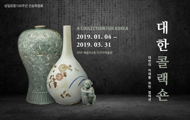삼일운동 100주년 간송특별전 대한콜랙숀 - A Collection for Korea 대한의 미래를 위한 컬렉션 삼일운동 100주년 간송 특별展 '대한콜랙숀'을 개최하며 1919년은 3.1운동이 일어난 해입니다. 세계 만방에 우리나라가 독립국임과 우리 민족이 홍익인간의 이념을 지닌 민족임을 선언한 이 비폭력 저항 운동의 중심에는 우리나라 최초의 민족사학인 보성학원이 있었습니다. 민족대표 33인 중에 학원의 중심 인사들이 다수 포함되어 있었고, 교내의 인쇄소인 보성사에서 ‘독립 선언문’을 35,000부 전량 인쇄했으며, 수많은 학생들이 만세 운동에 참여하기도 했습니다. 그 보성이 경영난으로 어려움에 처했을 때, 구원의 손길을 내민 분이 우리 문화재의 수호자로 알려진 간송 전형필입니다. 일본인의 손으로 넘어갈 뻔했던 <청자상감운학문매병>을 돈가방을 들고 가 단숨에 가져온 이야기, 세계적인 골동품상 야마나카 상회에 맞서 <백자청화철채동채초충난국문병>을 경매로 손에 넣은 이야기, 영국 출신 일본 주재 변호사 존 개스비로부터 큰 돈을 치르고 수집가라면 누구나 선망하던 도자기 컬렉션을 인수한 이야기는 전설처럼 전해져 왔습니다. 간송 전형필은 격변하는 역사의 소용돌이 속에서도 듬직하게 문화보국과 구국교육이라는 자신만의 방법으로 항일에 동참했습니다. ‘대한콜랙숀’이란 간송이 대한민국의 미래를 위해 일제에 대항해 모으고 지킨 우리의 국보, 보물, 유물뿐만 아니라, 인재 양성을 위해 보성학교를 인수한 것 또한 포함합니다. 단지 모으고 지키는 것에 그치지 않고 그 유산과 그 속에 깃든 정신이 대한민국의 미래로 전해지기를 바랐던 간송의 마음을 느껴보시기를 바랍니다.